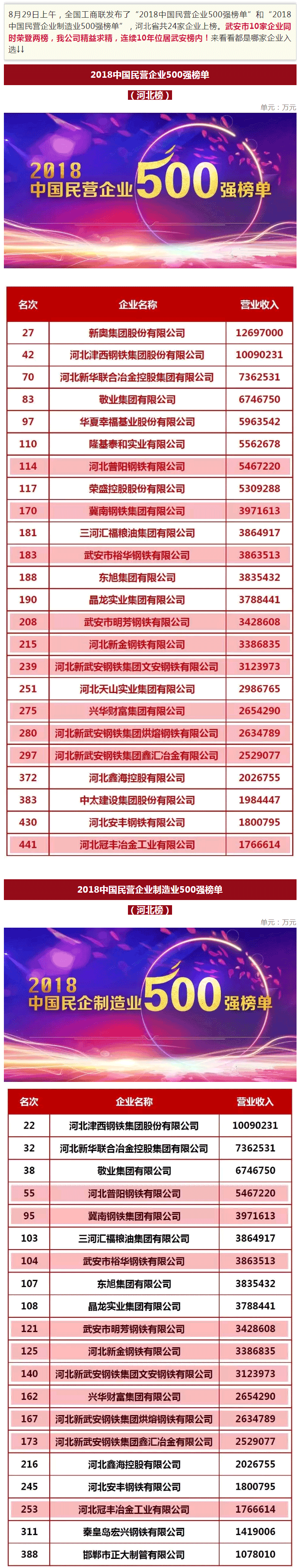 新闻摘要:鑫汇公司荣登中国民营企业500强,武安市10家企业荣登两榜